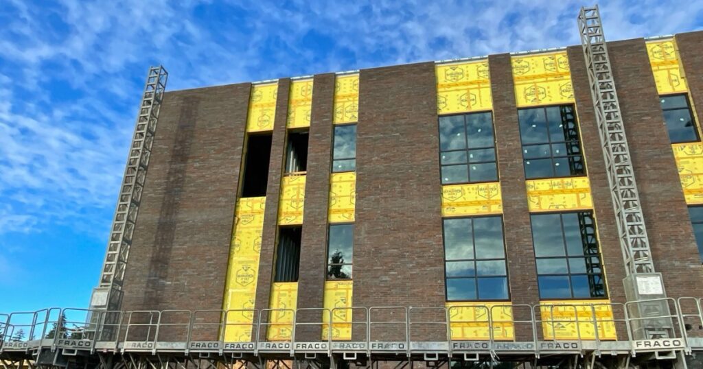 • The curtain wall system is being installed in Building D.​